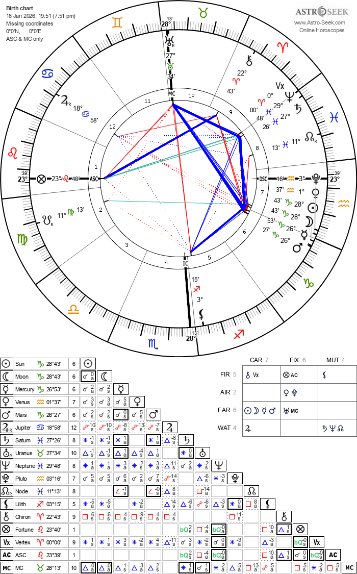 Trigon Urana na konci znamení Býka na již výše zmíněnou konjunkci v Kozorohu a Vodnáři ovlivňuje naše životy příslibem nutného pohybu a vyčištění informačního pole od lží a dezinformací, nenápadně začíná ve společnosti relativizovat různá přesvědčení, která vám byla předkládaná jako jediná pravda. Tato energie proudí prostorem harmonicky ovlivněná sextily na Neptuna stojícího na konci znamení Ryb zabarveného beranskými vlastnostmi. Stojíme nyní na prahu velkých změn a naším úkolem a nutností je třeba jim dát správnou vizi a začít jim dávat pevný základ, aby do měsíce mohly začít plnit naše přání, pokud jsou v souladu s naším přirozeným nastavením a vesmírnými zákony příčiny a následku.